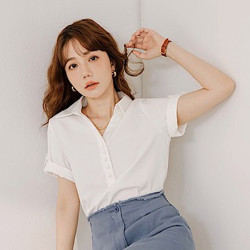 簡約翻領包釦袖絆短袖上衣-OB大尺碼