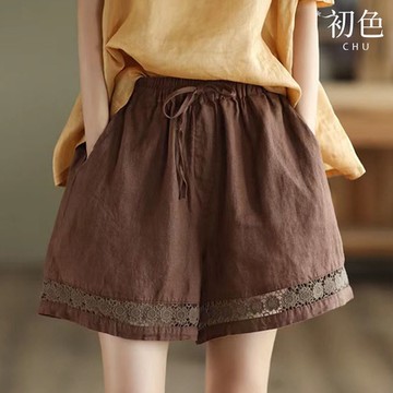 初色 復古風鏤空蕾絲花邊寬鬆鬆緊腰薄款休閒褲寬褲短褲-共7色-13985(M-4XL可選)