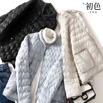 初色 立領素色壓紋口袋單排釦長袖棒球外套羽絨棉外套-共3色-32561(M-2XL可選)