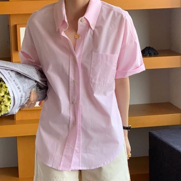 日系復古 藍色條紋短袖襯衫