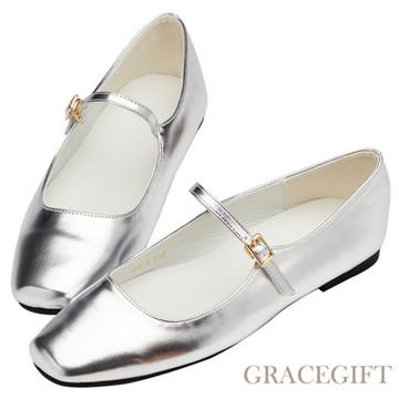 【Grace Gift】氣質方頭瑪莉珍芭蕾平底鞋 銀