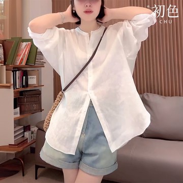 ★五折價$499★糖罐子【E65198】袖口刺繡側抓皺純色襯衫→現貨