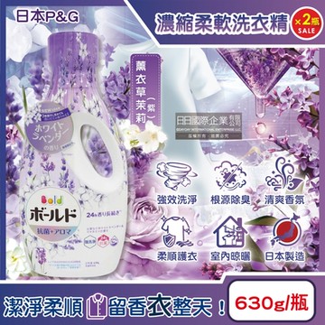 (2瓶超值組)日本P&G-Bold超濃縮強洗淨室內晾曬除臭香氛柔軟洗衣精630g/瓶-薰衣草茉莉(紫)(持香約24小時,消臭柔順洗滌劑,直立式,滾筒式洗衣機適用)