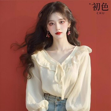 初色 法式荷葉邊輕薄V領長袖襯衫上衣女上衣-白色-36964(M-XL可選)