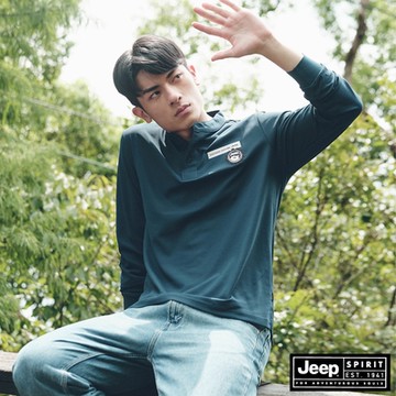 JEEP 男裝 亨利領素色長袖POLO衫-藍色