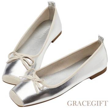 【Grace Gift】優雅方頭蝴蝶結芭蕾舞平底娃娃鞋 銀