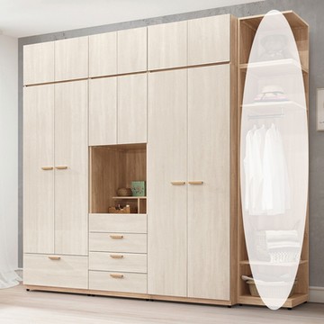 直人木業-北歐白楓木高被櫃衣櫃270公分(三抽75公分+配色雙門75公分+全白雙門75公分+開放櫃45公分)