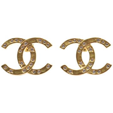 CHANEL 經典雙C LOGO半邊水鑽造型穿式大耳環(金色)