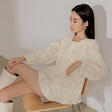立體紋理澎澎傘襬泡泡袖上衣-OB大尺碼