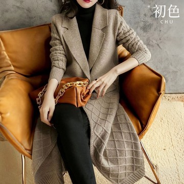 初色 韓版純色毛呢休閒百搭中長款翻領長袖西裝大衣外套女外套-共3色-38624(M-2XL可選)