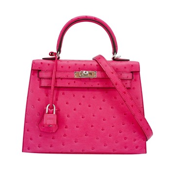 Hermes 展示品 Kelly 25 鴕鳥皮銀釦手提肩背包(糖果粉)