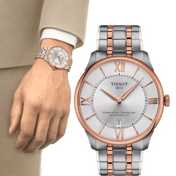 TISSOT 天梭 卡森 Powermatic 80 銀色錶盤 灰色及玫瑰金錶帶 腕錶 40mm 銀色