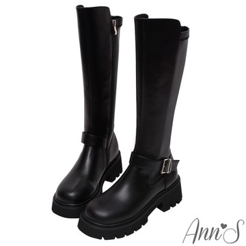 🧨開運專區最高現折2026🧨ANNSTAR 依依聯名-搖滾瑪莉珍貼腿彈力拼接厚底長靴7.5cm-黑
