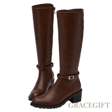 【Grace Gift】經典百搭圓頭皮革雙拉環長靴 黑