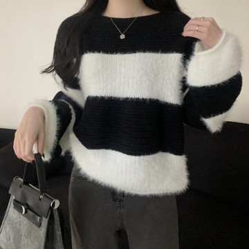 La Belleza仿水貂毛橫條紋撞色拼接軟糯毛衣慵懶風一字領燈籠袖針織毛衣