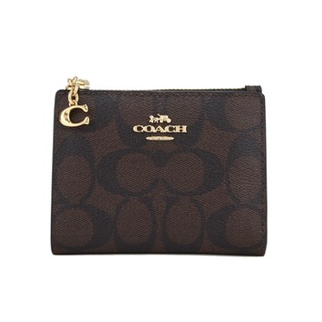 COACH 金屬馬車LOGO對折拉鍊短夾(咖啡/黑)