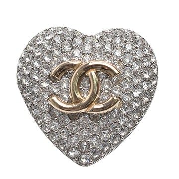 CHANEL 經典金色雙C LOGO水鑽鑲飾立體愛心造型胸針(銀色)