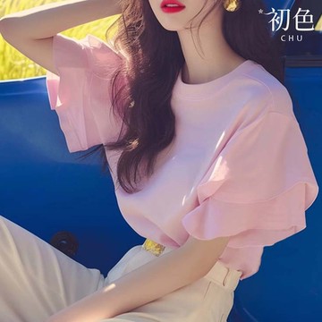 初色 文藝風純色圓領單排釦荷葉邊短袖襯衫上衣女上衣-藍色-12960(M-XL可選)