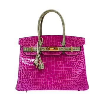 Hermes 愛馬仕 展示品 Birkin 鱷魚皮金釦手提鉑金包-30cm(C刻/桃紅/灰)