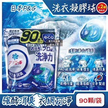 [日日好物]日本P&G-Ariel PRO級酵素強洗淨力去污消臭洗衣凝膠球90顆/袋-清新淨白(藍)(家庭號補充包,去黃亮白洗衣球,筒槽防霉洗衣膠囊,全洗衣機型適用)