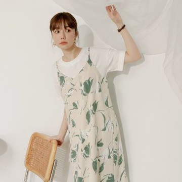 (L) 高腰質感碎花短袖滿版印花綠色連身裝