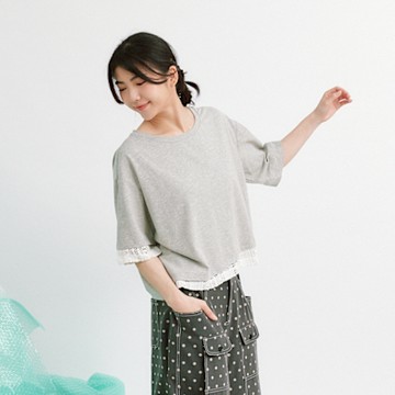 純色雪紡拼接袖蕾絲領口五分袖上衣