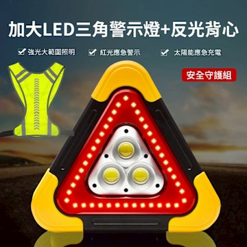 【super舒馬克】LED三角警示燈+反光背心守護安全組-太陽能/電池款任選(三角警示架 故障警示三角架 三角錐警示牌)