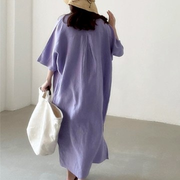 純色多色寬版圓領側開衩長袖洋裝