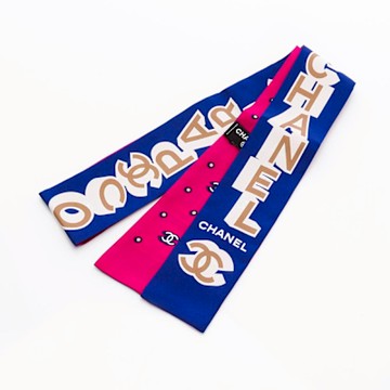 CHANEL香奈兒 滿版立體文字及小雙C點點雙面絲巾(深藍/桃紅)