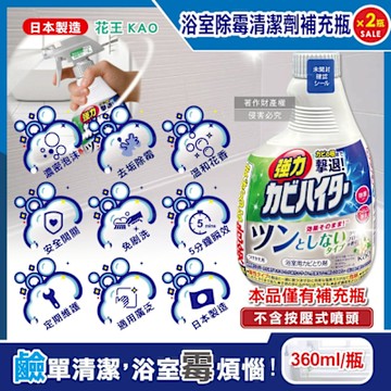(2瓶超值組)日本KAO花王-浴室免刷洗強力除霉鹼性泡沫清潔劑補充瓶360ml/瓶-溫和花香(廁所洗滌劑替換瓶,衛浴磁磚凹縫濃密除垢噴霧,蓮蓬頭軟管膠條防霉)