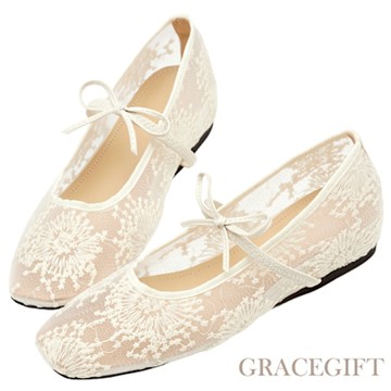 【Grace Gift】阿朗頌晨光繡花蕾絲內增高瑪莉珍鞋 米白