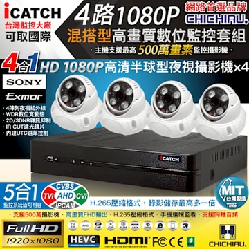 CHICHIAU H.265 4路5MP台製iCATCH數位高清遠端監控錄影主機(含SONY 200萬半球型攝影機x4)