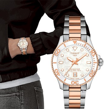TISSOT 天梭 Seastar 1000海洋之星300米潛水錶/黑X玫瑰半金/36mm/T1202102205101