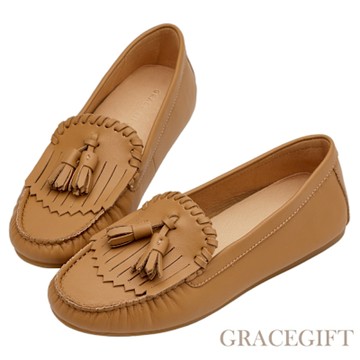 【Grace Gift】經典之作真皮手工縫線流蘇莫卡辛鞋 棕
