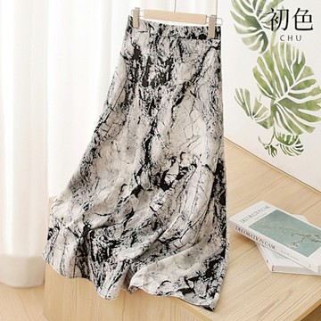 初色 暈染水墨印花氣質高腰顯瘦A字裙中長裙半身裙-花色-12327(M-XL可選)