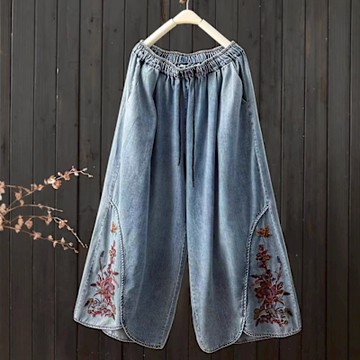 點我下載設計所在 棉麻隨性風 復古刺繡鬆緊腰牛仔寬鬆寬管長褲(3色 L-XL可選)