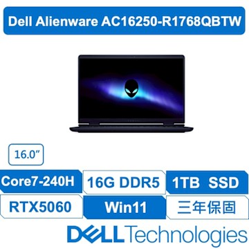 DELL戴爾 Alienware AC16250-R1768QBTW 16吋電競筆電 (Core 7-240H/GeForce RTX 5060 8GB /16GB/1TB/W11家用版/原廠三年保)