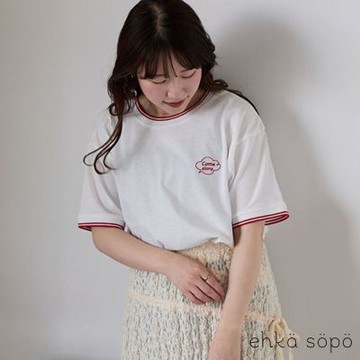 【ehka sopo】羅紋配色滾邊標誌刺繡短袖T恤