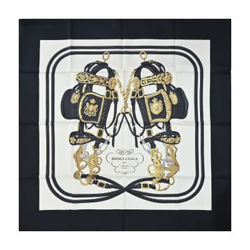 Hermes 愛馬仕 Brides de Gala 90 cm典藏手工捲邊斜紋真絲方巾(黑/奶油/金)