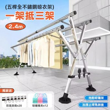 STYLE 格調 大升級!!加粗管徑2.4米X型三桿全不鏽鋼伸縮曬衣架/伸縮衣架(贈防倒神器/防風扣/彩色夾)