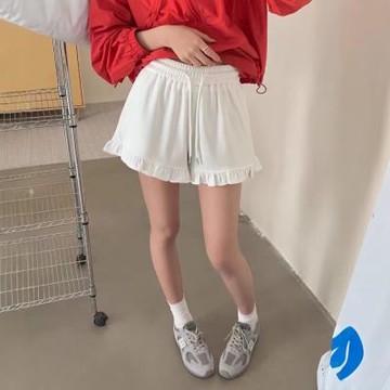 La Belleza甜美冰絲涼感鬆緊腰抽繩荷葉木耳滾邊闊腿短褲
