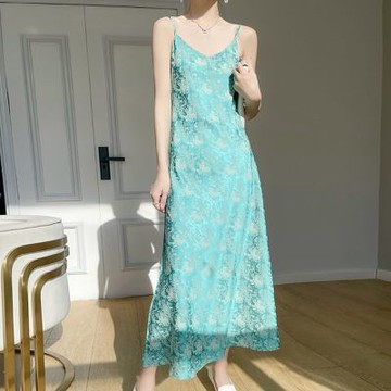 夏季新款提花吊帶連衣裙女國風醋酸緞面仿真絲長裙高腰高級A字裙