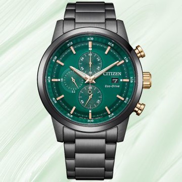CITIZEN星辰 CHRONOGRAPH CA0770-72X 光動能碼錶計時鋼帶時尚腕錶 綠面 43mm
