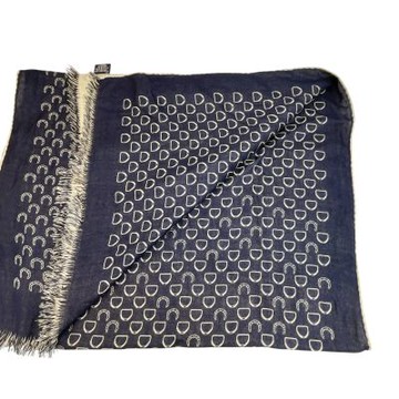 HERMES 經典喀什米爾羊絨雙面雙色馬蹄圖驣流蘇圍巾(深藍配淺灰)