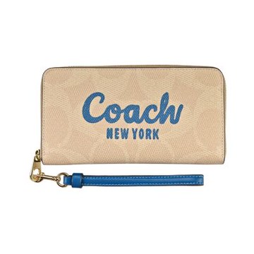 [平輸版] 【COACH】海礦藍美式校園風LOGO燙印沙色C LOGO PVC手掛拉鍊長夾 真品平輸
