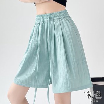 初色 冰絲肌理感薄款抽繩直筒鬆緊高腰褶皺闊腿短褲-共6色-35434(M-XL可選/現貨+預購)