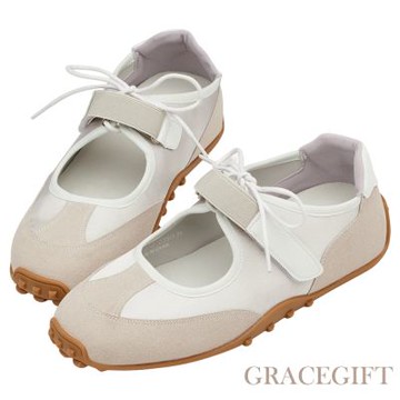JP Queen New York 時尚真皮綁帶芭蕾風拼接女款內增高德訓休閒鞋(2色可選)