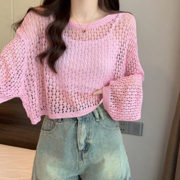 韓系慵懶簡約風鏤空防曬罩衫女2024夏季薄款寬松外穿長袖針織上衣