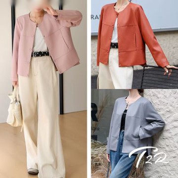 晚霞粉紫 3色 中性純色極簡一粒扣無領西裝 簡約大氣寬松廓形外套