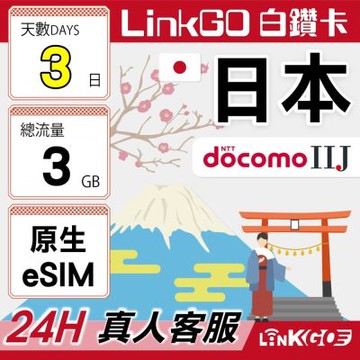 LINKGO白鑽卡 日本原生 eSIM卡 DOCOMO/IIJ電信 3天 總量型3GB(日本網卡 沖繩 大阪 北海道 東京)